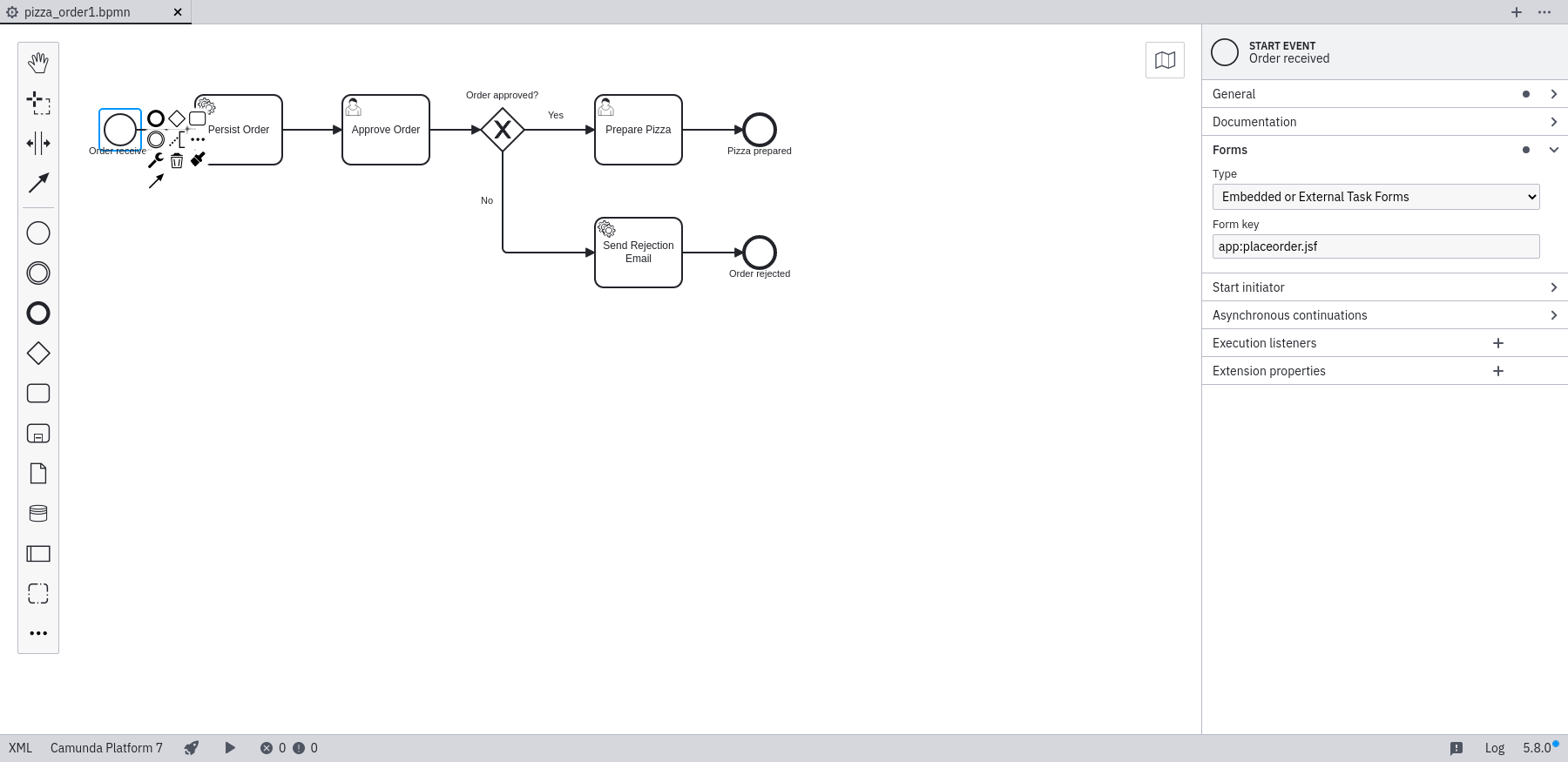 Open the process with Camunda Modeler. Click on the start event. In the properties view, set the Form Key property to app:placeorder.jsf. This means that we want to use an external JSF form and that the form is loaded from the application.