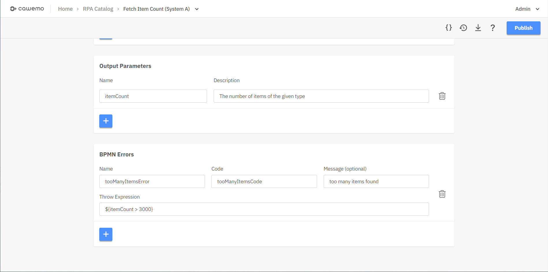Please remember, before the template can be used in the Camunda Modeler, it needs to be published once by clicking the “Publish” button in the upper right corner. After publishing the template, you can synchronize it in the Camunda Modeler and update the template there at your service task. You can now adjust the error definition details if necessary.