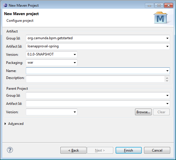 First, we set up a new Apache Maven based project in Eclipse. Let’s call it loanapproval-spring. The screenshot below illustrates the settings we choose. As we are deploying a web application, make sure to select Packaging: war.