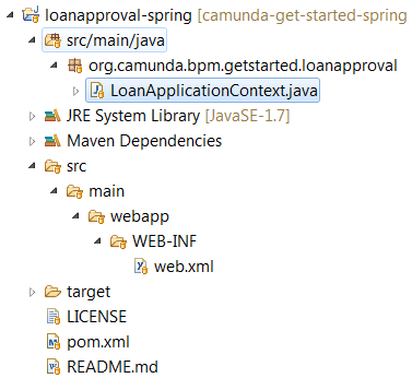 Next, we add a Spring ApplicationContext configuration class to the project. Create a Java class called LoanApplicationContext in the package org.camunda.bpm.getstarted.loanapproval.