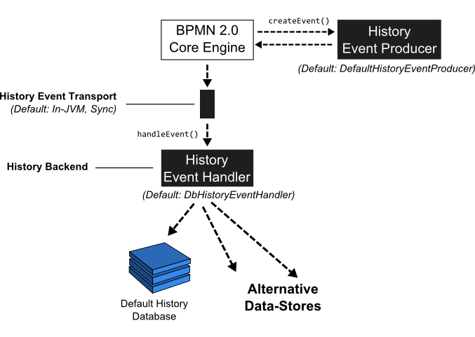 Note that if you provide a custom implementation of the HistoryEventHandler and wire it to the process engine, you override the default DbHistoryEventHandler. The consequence is that the process engine will stop writing to the history database and you will not be able to use the history service for querying the audit log. If you do not want to replace the default behavior but only provide an additional event handler, you can use the class org.camunda.bpm.engine.impl.history.handler.CompositeHistoryEventHandler that dispatches events to a collection of handlers.